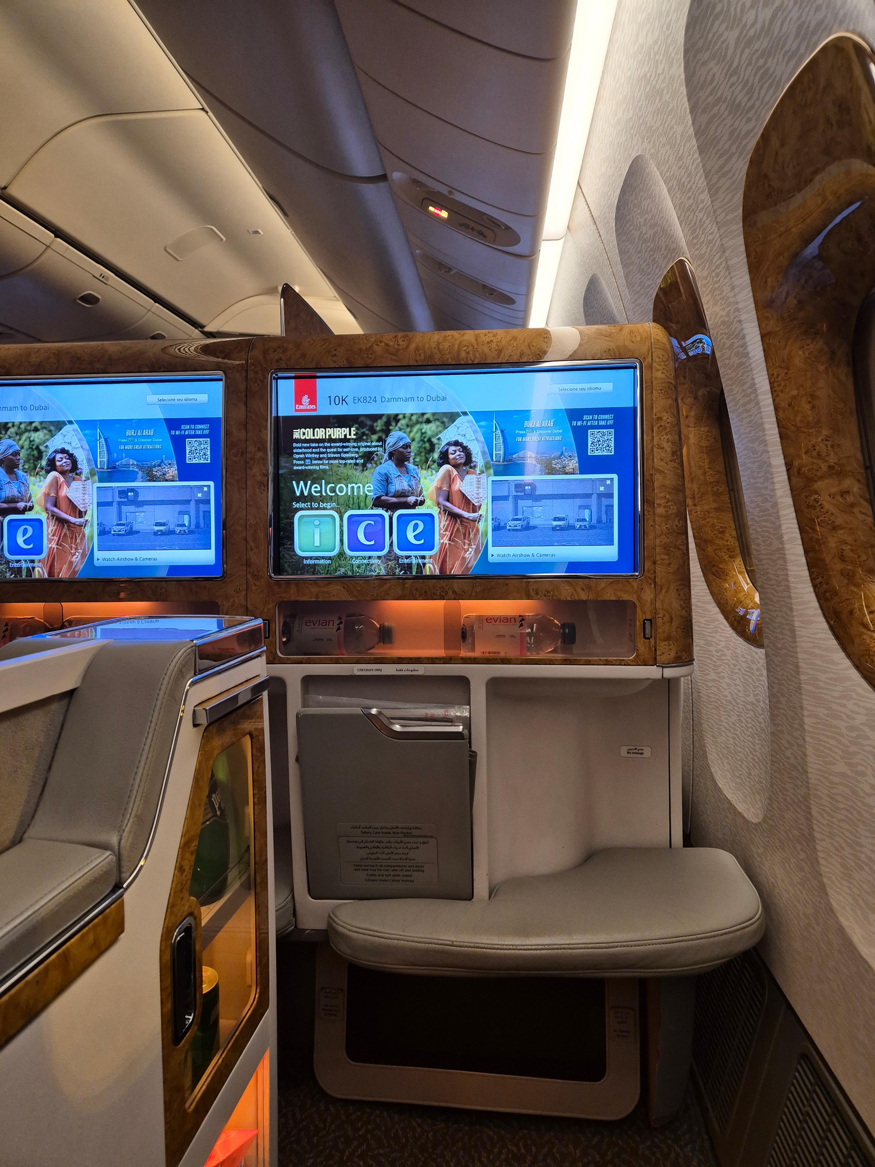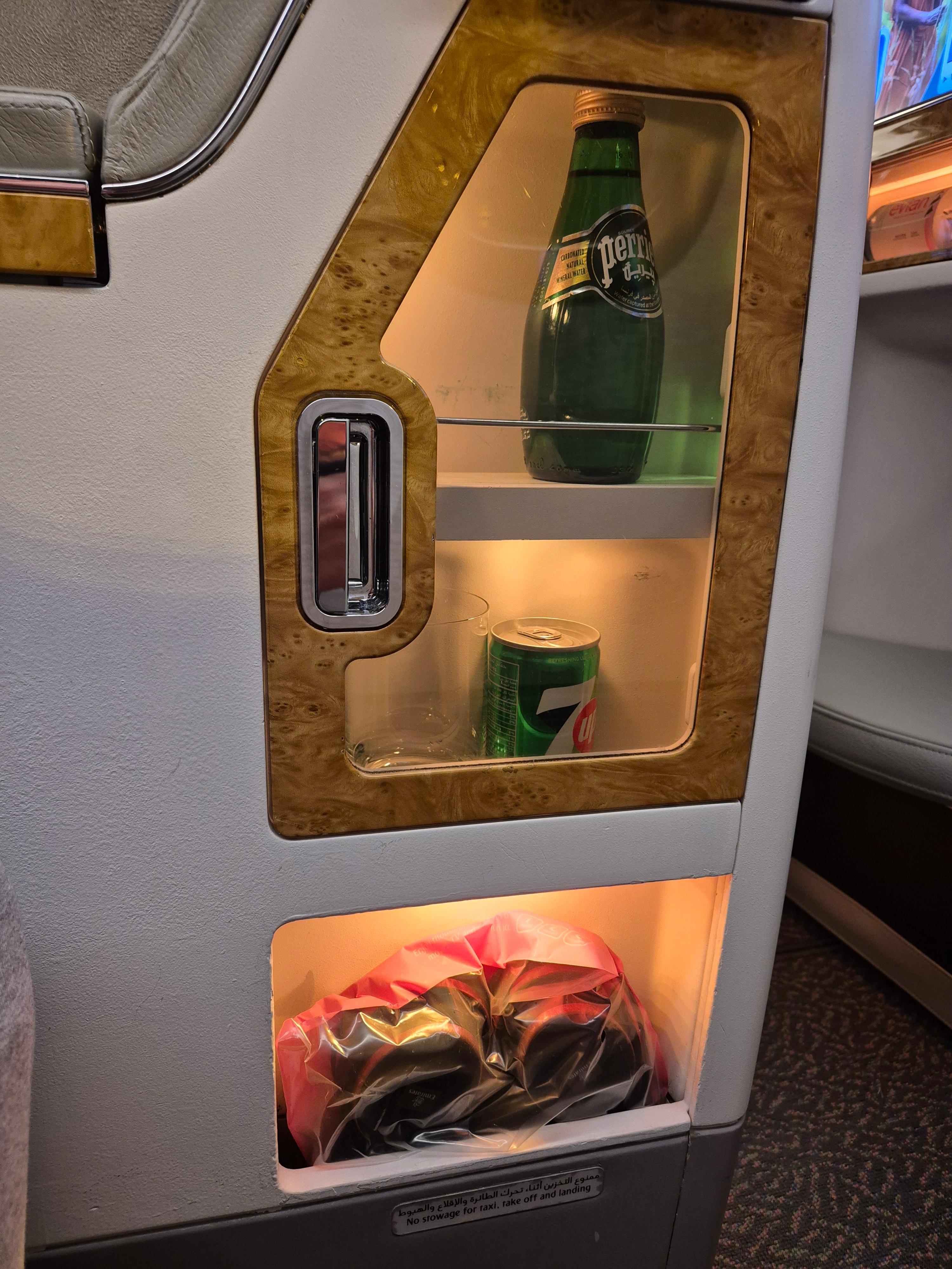 에미레이트에선 놀라웠던 것이, 자리마다 아래와 같이 음료들이 진열되어 있어서 본인이 필요할 때 바로 마실 수가 있다는 점이었다. 물론 사람을 불러서 부탁해도 되는 부분이나, 그러한 시간조차 단축시킬 수 있는 방법이 있다는 점에서 신기했다. 그리고 무엇보다도 좌석이 색감이 상당히 고급스럽다는 느낌이 드는 부분이 있었다.